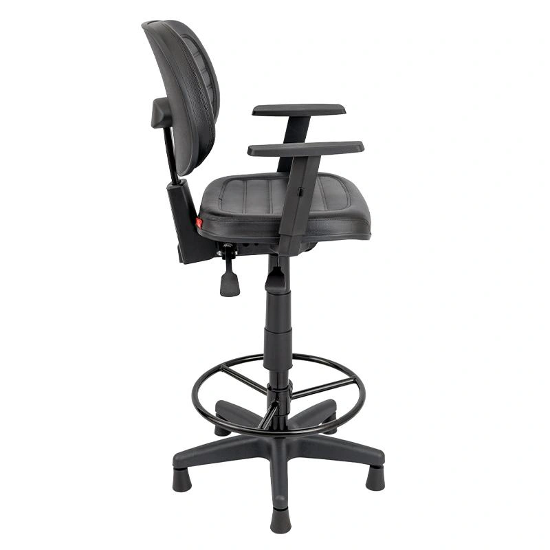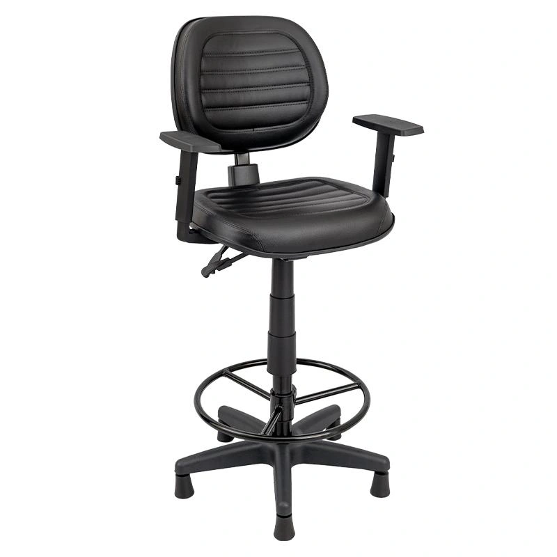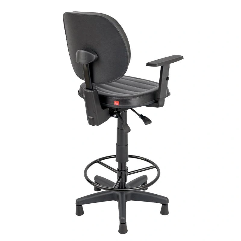 A cadeira caixa com apoio para pés é um modelo projetado para postos de trabalho elevados, como caixas de atendimento, balcões e recepções altas, onde a ergonomia é essencial para acompanhar a altura do plano de trabalho.